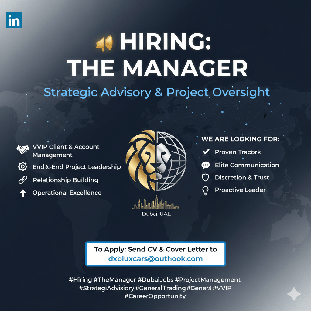 Hiring The Manager - Strategic Advisory & Project Oversight Location Business Bay Dubai, UAE Are you ready to manage high - stakes international accounts and drive strategic projects for VVIPs, government entities, and HNWIs Our firm, specializing in Project Management and General Trading Operations, is seeking an exceptional and proactive Manager to oversee our most sensitive and strategic engagements