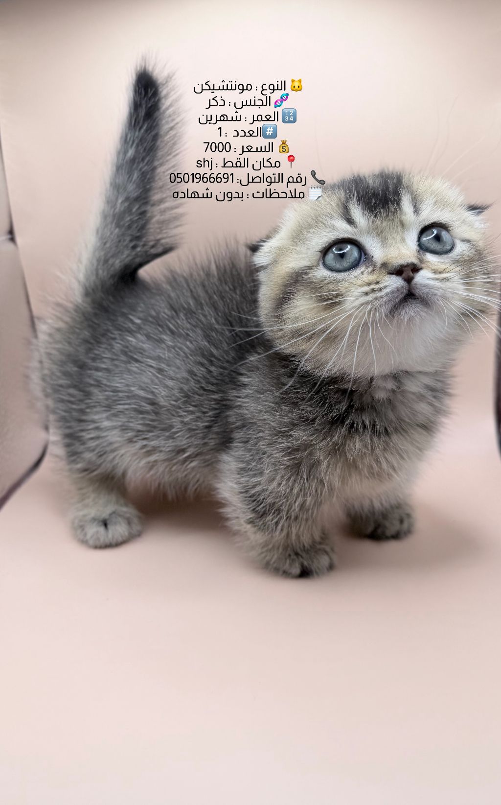 النوع مونتشيكن الجنس ذكر العمر شهرين العدد 1 السعر 7000 مكان القط shj رقم التواصل ملاحظات بدون شهادة