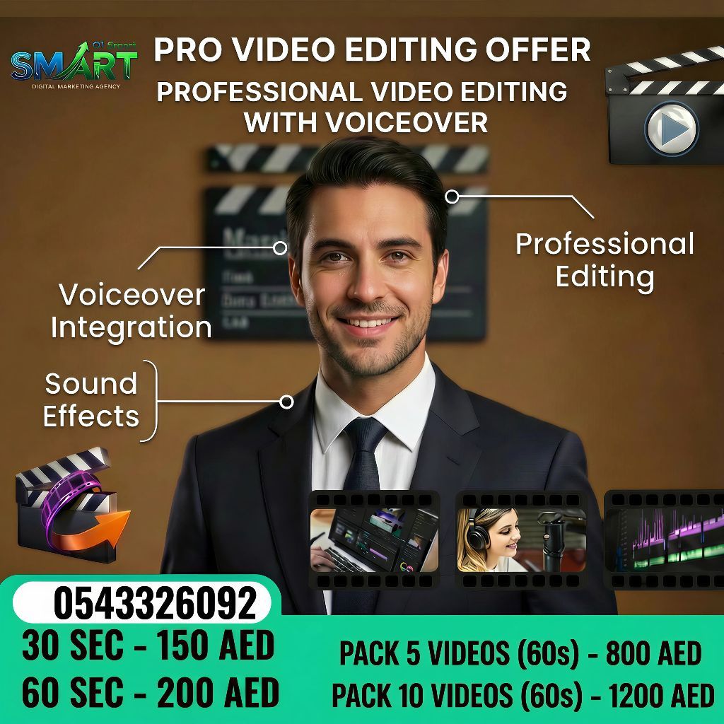 عرض احترافي للمونتاج الفيديو مع تسجيل صوتي مدمج باحترافية، مؤثرات صوتية، وجودة عالية تناسب الاعلانات والسوشيال ميديا. 30 ثانية ب 150 درهم، 60 ثانية ب 200 درهم. باقة 5 فيديوهات (60 ث ب 800 درهم، وباقة 10 فيديوهات ب 1200 درهم. مثالي للشركات ورواد الأعمال لزيادة التفاعل والمبيعات. احجز الآن وطور محتواك بجودة احترافية