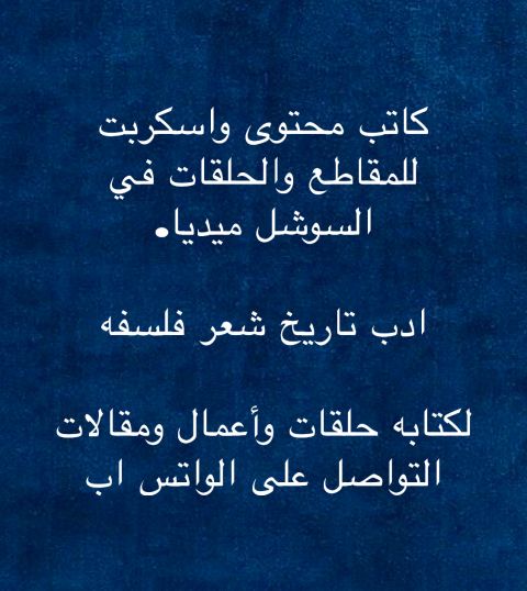 كتابة المحتوى والاسكربت لمقاطع الفيديو في السوشيال ميديا أو المقاطع القصيرة سوا كانت أدب أو تاريخ أو وعظ أو شعر لطلب كتابة المحتوى المذكور أعلاه تواصل واتساب مع امكانية اعطاء أفكار تساعدك على الظهور الاعلامي بشكل مميز وجميل سوا حلقات مطوله أو مقاطع زيلز قصيره