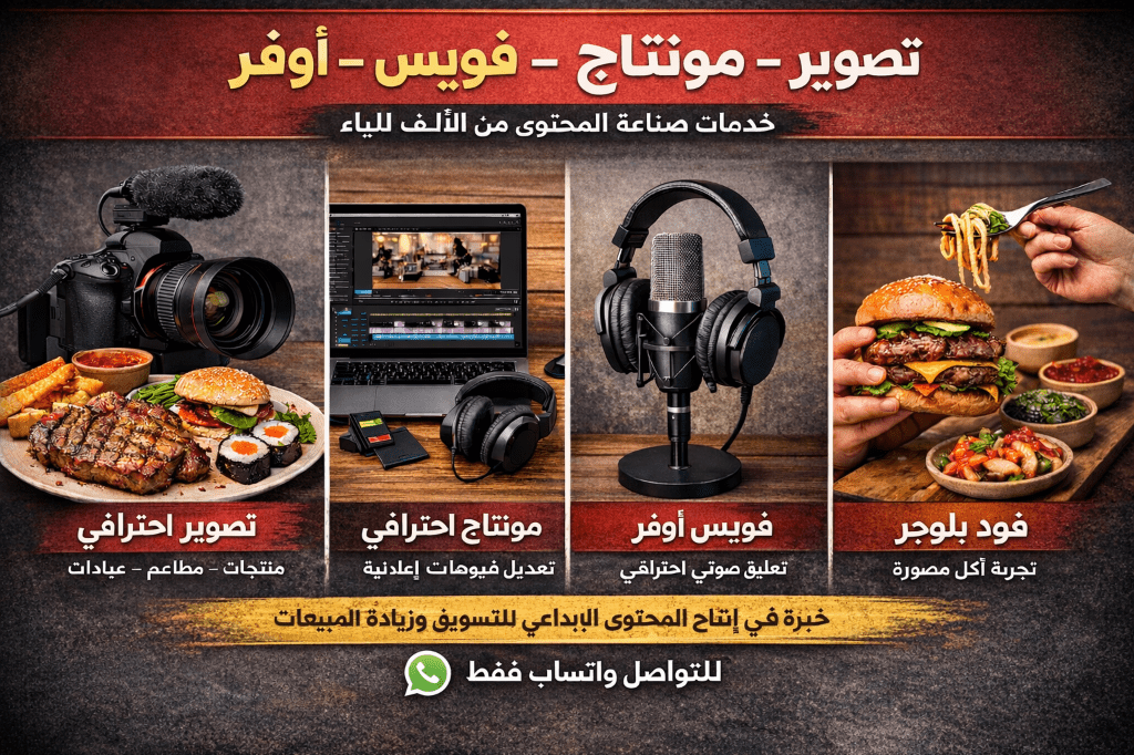 أقدم خدمات متكاملة لصناعة المحتوى المرئي من الألف للياء تصوير فيديو احترافي (منتجات مطاعم - عيادات - سوشيال ميديا) مونتاج وتعديل فيديوهات بشكل جذاب يناسب انستغرام، تيك توك، ويوتيوب تسجيل تعليق صوتي (فويس أوفر) عربي واضح ومؤثر - فود بالوغر تصوير وتجربة أطعمة ومطاعم بمحتوى يلفت الانتباه أفكار محتوى + تنفيذ + اخراج نهائي جاهز للنشر اشتغل بدقة، التزام وتسليم سريع. مناسب لأصحاب المشاريع المطاعم