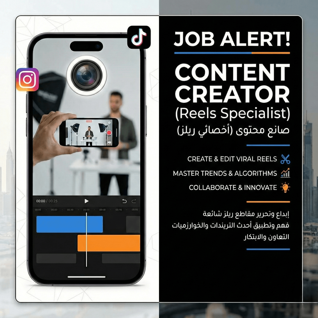 مطلوب Content Creator (Reels Specialist) نبحث عن شخص مبدع وشغوف بصناعة المحتوى البزنس باي يكون عنده خبرة في تصوير الريلز بالموبايل أو الكاميرا مونتاج احترافي للفيديوهات القصيرة (Reels) كتابة محتوى جذاب وقوي مناسب لمنصات السوشيال ميديا المتطلبات خبرة في تصوير وتحرير الريلز اجادة اللغة العربية واللغة الانجليزية تحدثا وكتابة بشكل جيد معرفة تر يندات السوشيال ميديا (Instagram / TikTok) القدرة على تحويل الأفكار
