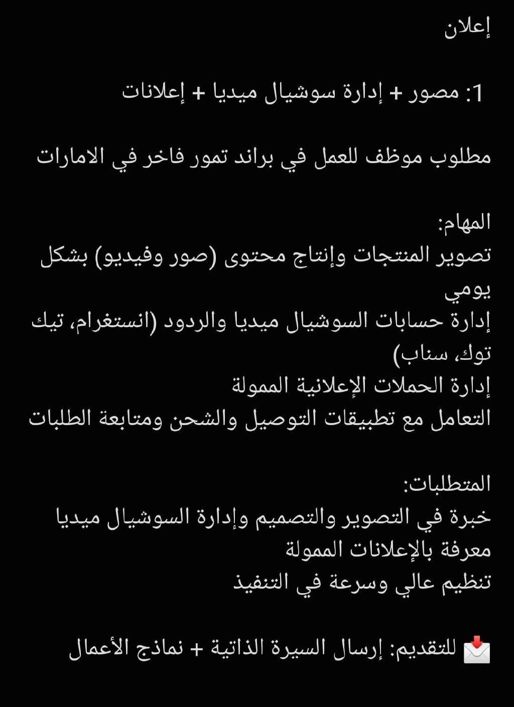 We are looking for an experienced photographer, graphic designer, and social media manager with knowledge of paid advertising. Candidates must be highly organized, fast, and fluent in both Arabic and English