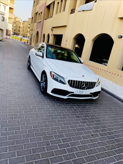 Mercedes C Class C300 model, manufactured in 2018, American import. Odometer reading 84000 km. Full specifications including Smart entry and fingerprint start, steering wheel controls, voice commands, cruise control, screen and screen control, dual mouse and camera, rear air conditioning, leather seats, electric seats with memory, blind spot monitoring, electric trunk, mirror signals, panoramic sunroof