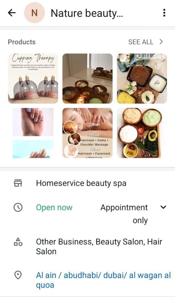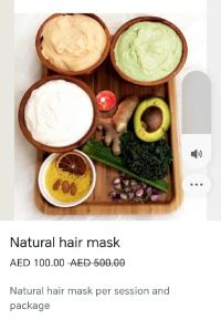 Nature beauty spa Natural hair mask AED100 Dalka bridal AED200 Relaxing massage AED120