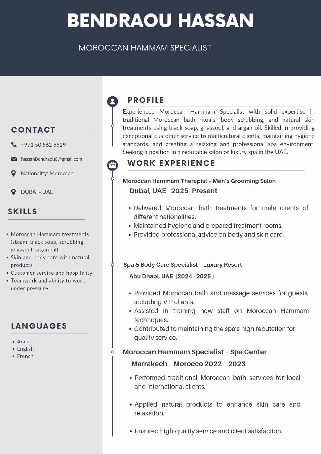 أخصائي حمام مغربي بخبرة عملية في المغرب والامارات، متخصص في تقديم الجلسات التقليدية للحمام المغربي باستخدام المنتجات الطبيعية (الصابون البلدي وغيرها) أتمتع بقدرة عالية على خدمة الزبائن، التعامل مع مختلف الجنسيات، والحفاظ على أعلى معايير النظافة والجودة. ابحث عن فرصة عمل في صالون أو منتجع صحي في الامارات لتقديم خبرتي المهنية