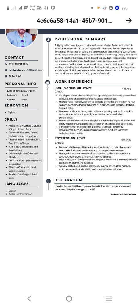أنا حلاق خبرة في دبي أربع سنوات، خبرة في جميع أنواع الصبغة والبروتين والكراتين وجميع أنواع تنظيف البشرة وقص الشعر واللحية ملحوظة يوجد إقامة معي قابلة للاعارة وهذا رقمي