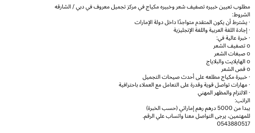 مطلوب موظفات جميع التخصصات للعمل في مجموعة صالونات نسائيه معروفه في الشارقة ودبي المطلوب 1. موظفة استقبال 2. كوافيرة وخبيره مكياج ذات خبرة عالية في تلوين الشعر والقص والتساريح 3. خبيره واكس وحف وفيشيل ونقش حنا التواصل واتساب على الرقم