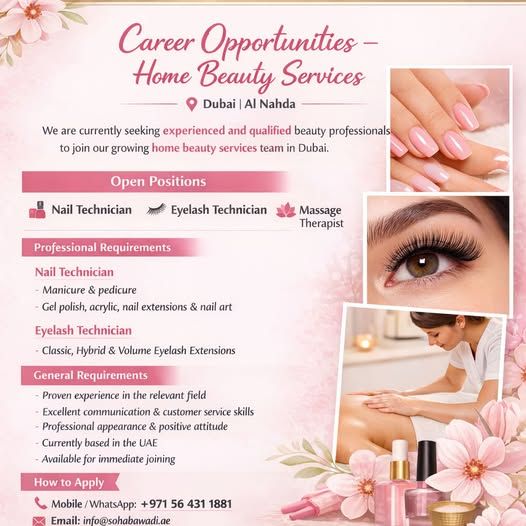 We Are Hiring in Al Nahda - Home Beauty Services Professionals We are currently seeking experienced and qualified professionals to join our growing home beauty services team. Open Positions Nail Technician Eyelash Technician Hair Stylist Massage Therapist Professional Requirements Nail Technician Manicure & Pedicure Gel Polish Acrylic Nails Nail Extensions Nail Art Eyelash Technician Classic Eyelash