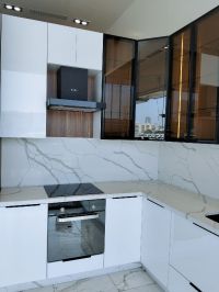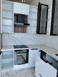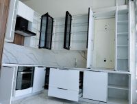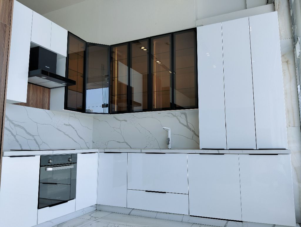 الغرض من البيع لتجديد المعرض، مطبخ خشب MDF بدون اجهزة كهربائية كوارتس طاولة وخلفية اللون أبيض المساحة 320 سم + 150 سم، حرف L الارتفاع 270 سم، العمق 60 س 6 درف زجاج مع فريم ألومينيوم أضاءه داخلية وخارجية