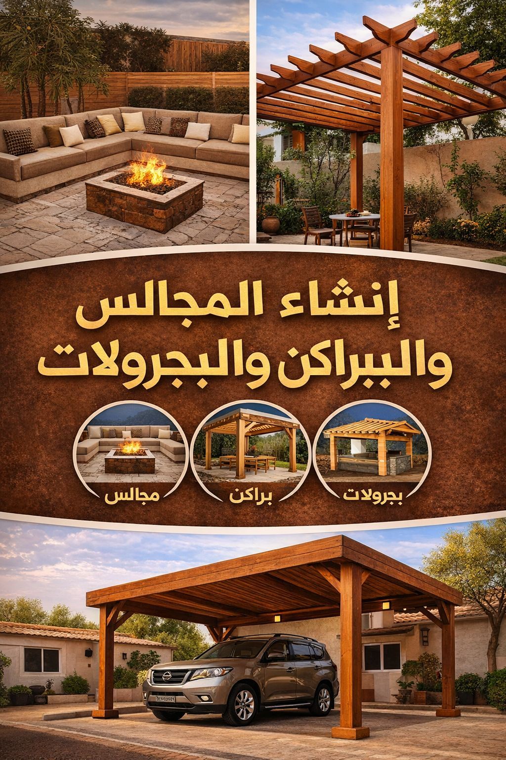 Majlis, pergolas, and carports construction service for homes and villas. We provide modern and elegant designs for your outdoor spaces with a professional team ensuring high - quality installation of wooden and metal structures. Whether you want a luxury Majlis, a garden pergola, or carports for your outdoor areas, we deliver your project with precision and professionalism. Book your project now
