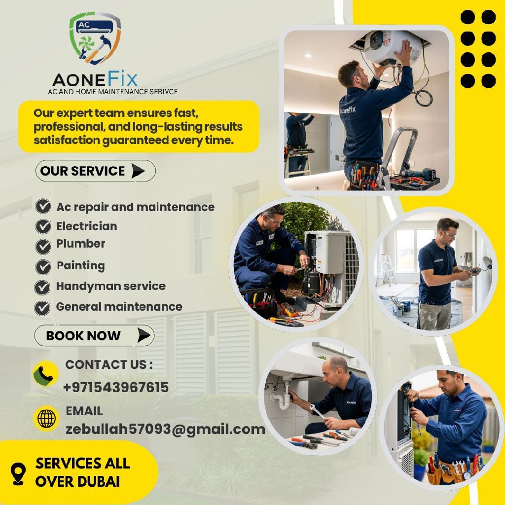 AoneFix AC and home maintenance is a leading service provider in Dubai and Sharjah, offering expert AC repair, AC maintenance, AC installation, and deep cleaning services for all air conditioner types. We also provide reliable home maintenance solutions including electrical, plumbing, painting, and handyman services. Our skilled technicians use advanced tools to ensure your AC runs efficiently