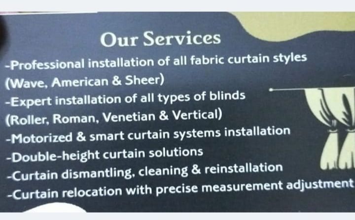 نقدم خدمات تركيب ستائر وبلاندز باحترافية عالية مع دقة في المقاسات وتشطيب نظيف يرضي العميل. خدماتنا تركيب جميع أنواع الستائر القماش (Wave - American - Sheer) تركيب جميع أنواع البلاندز (Roller - Roman - Venetian - Vertical) تركيب الستائر الكهربائية والأنظمة الذكية حلول الستائر ذات الارتفاع المزدوج (Double Height) فك، تنظيف واعادة تركيب الستائر نقل الستائر مع ضبط المقاسات بدقة تامة خبرة طويلة