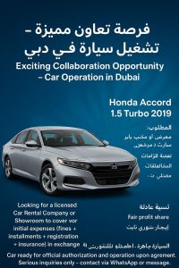 Opportunity for Car Rental Companies or Partners - Honda Accord 2019 Turbo Available for rental or partnership operation in the UAE A Honda Accord 1.5 Turbo - 2019 model, in excellent condition. Registration and insurance need renewal (can be renewed after settling fines) The owner is abroad but can provide official power of attorney for operation. Flexible cooperation options