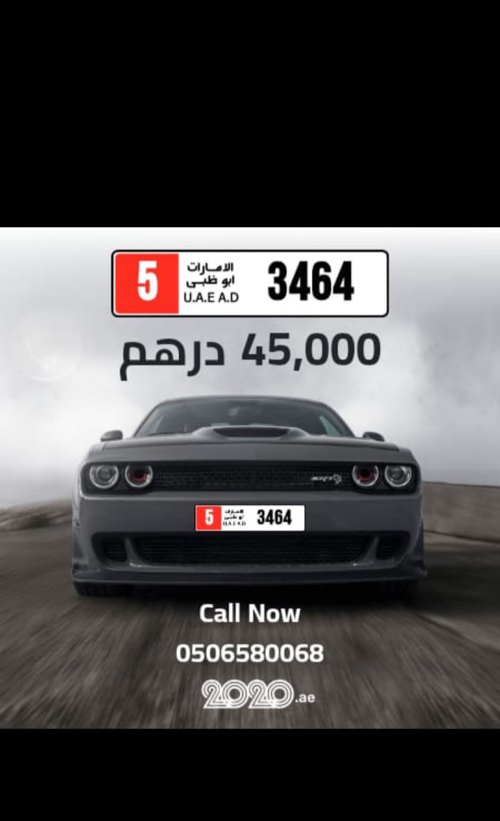 نعرض لكم رقم لوحة سيارة مميز للبيع أبو ظبي رقم رباعي. رقم لوحة. 3464 الفائه. 5 السعر. 45000