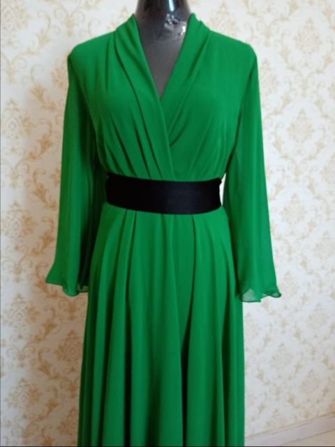 فستان طويل للبيع القصه كلوش فرنسي نوع القماش شيفون اللون أخضر عشبي مع حزام أسود المقاس XL السعر 150 درهم للتواصل