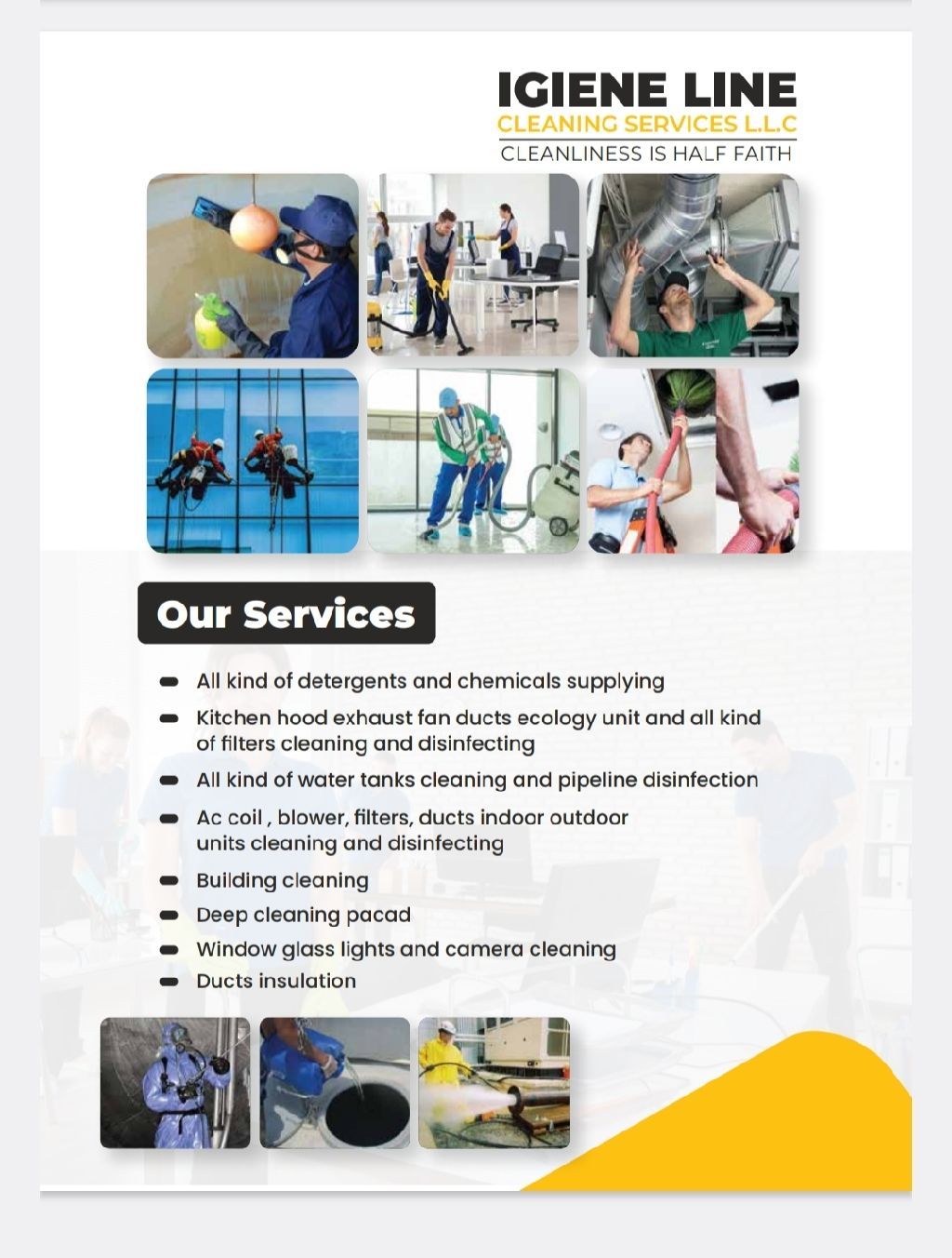 Igiene line cleaning services provide professional cleaning services water Tank cleaning and pipeline disinfection kitchen hood cleaning AC duct cleaning all over UAE we are located ad Dubai UAE