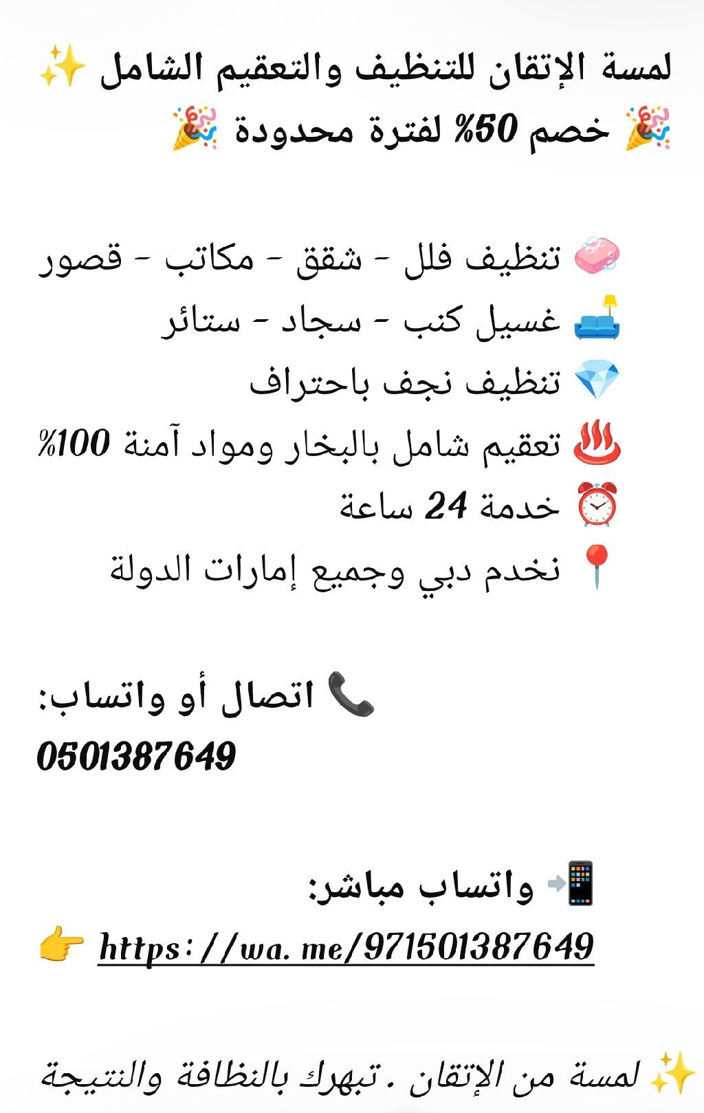لمسة الاتقان للتنظيف والتعقيم الشامل خصم 50% لفترة محدودة تنظيف فلل - شقق - مكاتب - قصور غسيل كنب - سجاد - ستائر تنظيف نجف باحتراف تعقيم شامل بالبخار ومواد آمنة 100% خدمة 24 ساعة نخدم دبي وجميع امارات الدولة اتصال أو واتساب مباشر لمسة من الاتقان تبهرك بالنظافة والنتيجة