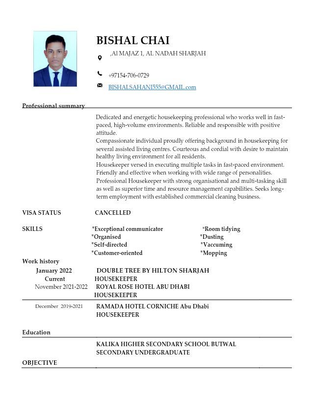 السيد/ السيدة مدير التوظيف المحترم، أتقدم بطلب وظيفة موظف تنظيف الغرف. لدي خبرة في تنظيف وصيانة الغرف وضمان رضا الضيوف. أنا شخص مجتهد وموثوق وجاهز للانضمام فورا في دولة الامارات. يسعدني أن أساهم في فريقكم. شكرا لكم على وقتكم واهتمامكم. مع خالص التحية، بيشال تشأي