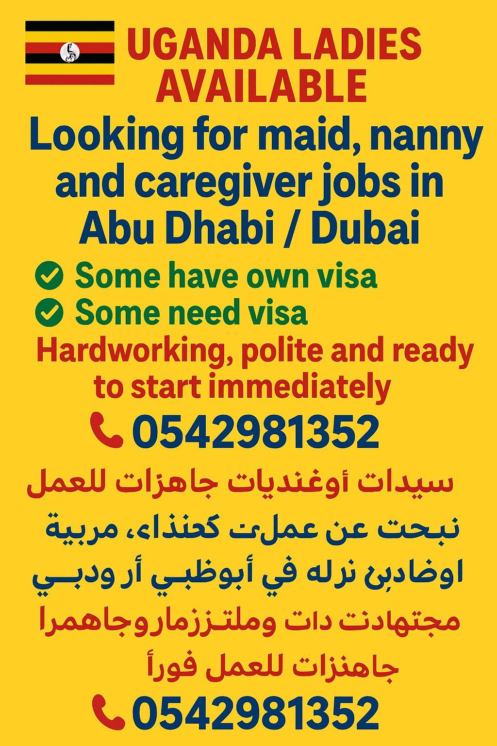 Am Noor from uganda, am looking for job as maids, nanny and caregiver job in Abu Dhabi or Dubai. I have 5 years of experience in UAE, I can take care of elderly people, women and men, kids and I know how to change diapers, how to give them company clean and laundry please am trustworthy and respectful person I will be happy when you give me your job thanks
