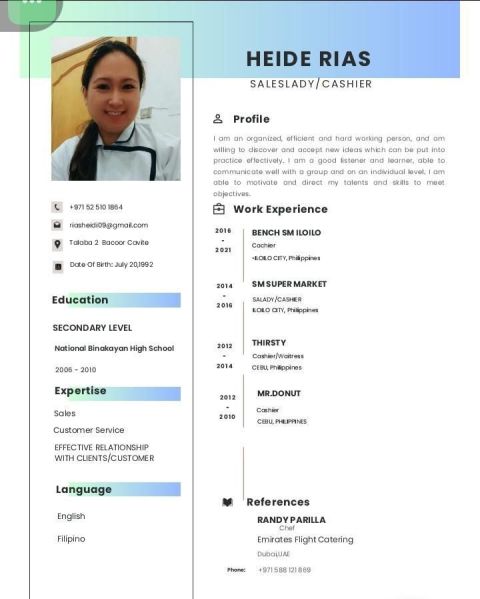 Hello sir, madam im heidi rias and I am 33 years old I know how to speak English and Arabic I find job immediately I working experience as a saleslady and cashier and cleaners hope u give me a change to choose as you're worker and I will do my best as your applicant