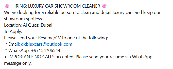 HIRING Luxury CAR SHOWROOM CLEANER (Male) We are looking for a reliable person to clean and detail luxury cars and keep our showroom spotless. Location Al Quoz, Dubai To Apply Please send your Resume/ CV to one of the following Email WhatsApp IMPORTANT NO CALLS accepted. Please send your resume via WhatsApp message only