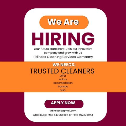 Your future starts here Join our innovative company and grow with us Tidiness Cleaning Services Company send us your resume or/ CV or WhatsApp us + or + or visit us here in Al Karama al maskan bldg shop Dubai