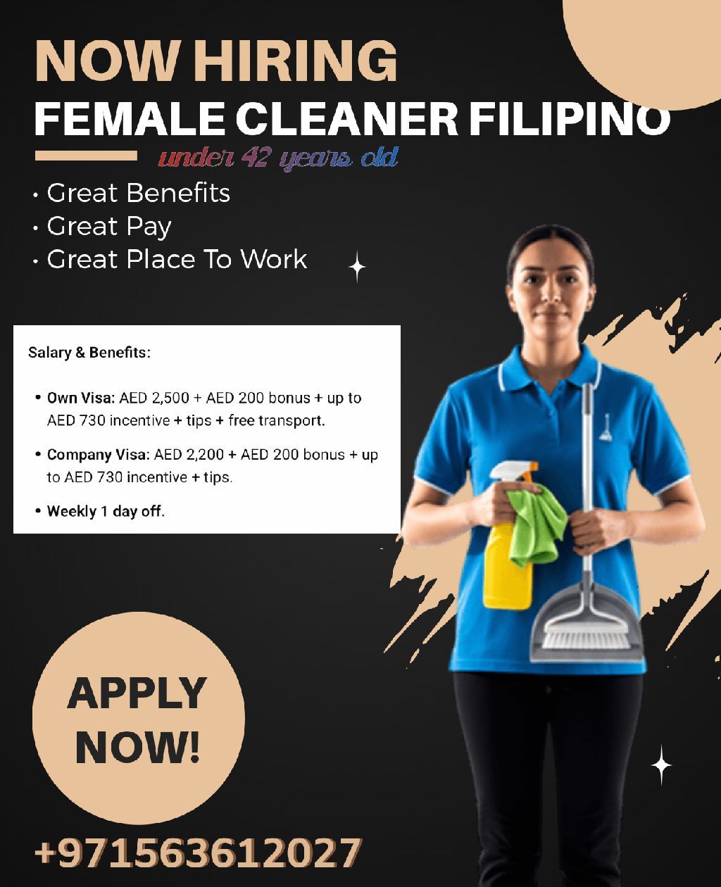We are hiring Filipino cleaners (age below 42) for residential and commercial cleaning services in Al Satwa, Dubai, UAE. Candidates should be hardworking, responsible, and willing to learn. Even new candidates can apply we provide full training, and training will be paid. Salary & Benefits Own Visa AED2500 + AED200 bonus + up to AED730 incentive + tips free transport. Company Visa AED2200 + all