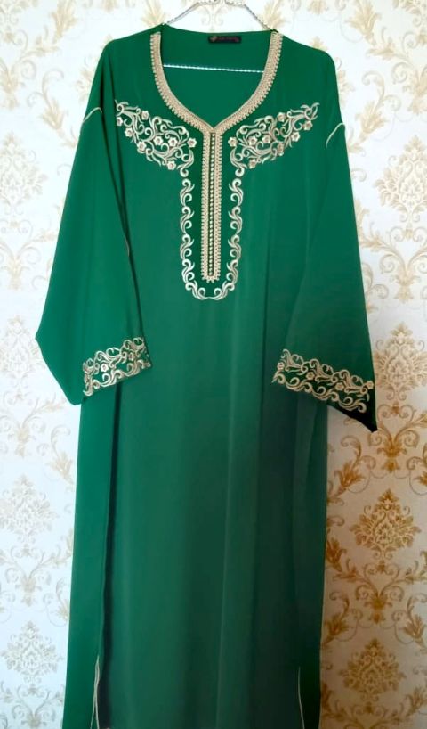 جلابية للبيع من المغرب استعمال مرة واحدة وبحالة ممتازة اللون أخضر عشبي، بتطريز ذهبي المقاس لارج السعر 100 درهم
