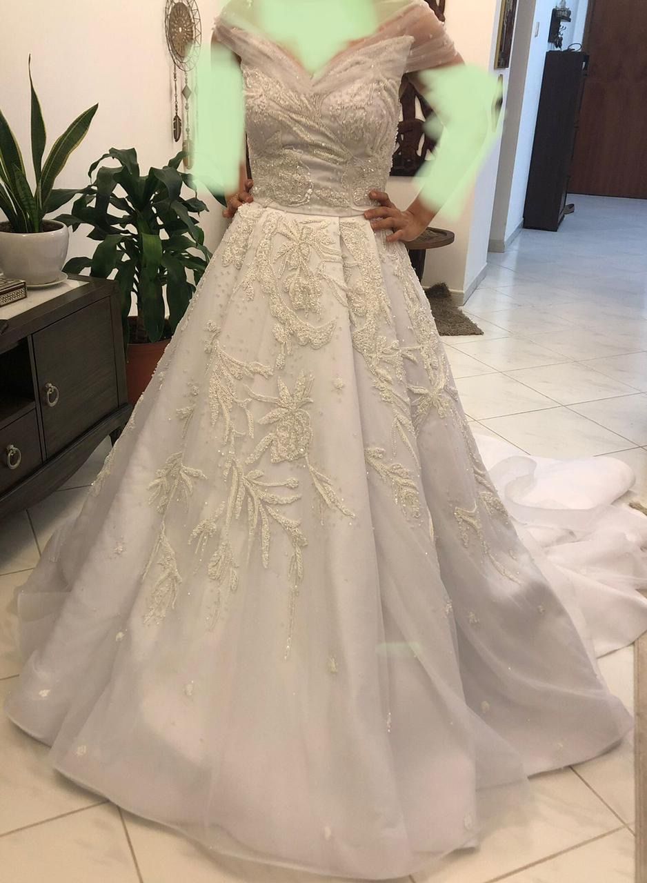 فستان عروس روعة تفصيل من ديزاينر لبناني وخامه فخمة والشغل هاند ميد كامل ومتقن مع الطرحه والجيبون والهد بيس ذوق وأناقة في اللبس ويشووق عالجسم ومشغول كامل ولمعته تسحر ديزاين ملكي والفستان لبسه واحدة فقط مقاس S M سعر التفصيل 8000 درهم سعر البيع 4000 درهم للتواصل