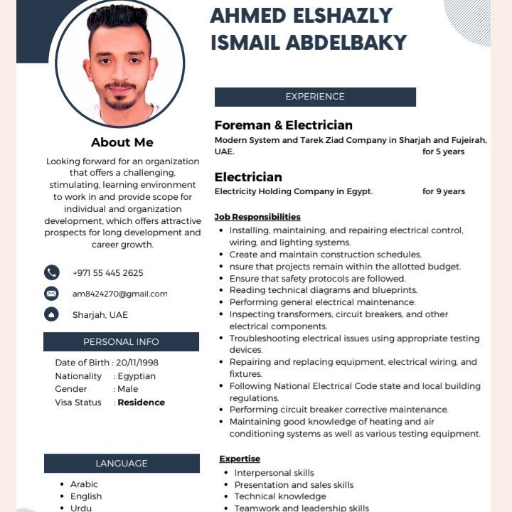 أنا فورمان كهرباء خبرة دخل الدولة محتاج شغل في شركة