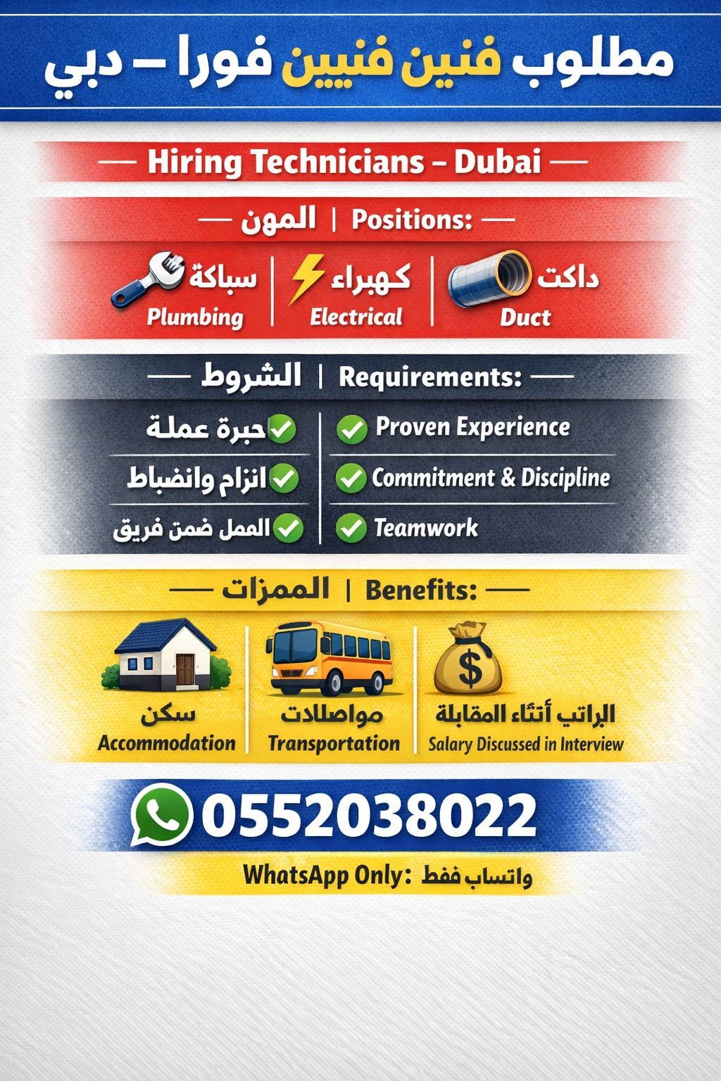 مطلوب فنيين للعمل فورا - دبي ديرة شركة مقاولات تطلب للتعيين فني سباكة فني كهرباء فني داكت الشروط خبرة عملية في نفس المجال الجدية والانضباط في العمل القدرة على العمل ضمن فريق المميزات توفير سكن توفير مواصلات الراتب يحدد أثناء المقابلة مكان العمل دبي