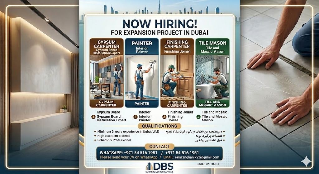 WE ARE HIRING Gypsum Carpenter/ PAINTER/ TILE MASON/ JOIN OUR TEAM IN Dubai Are you a skilled professional looking for a new opportunity Our company is expanding, and we are looking for experienced workers to join our ongoing projects in Dubai We are looking for Gypsum Carpenters (Installation Experts) Interior Painters Finishing Joiners (Furniture & Woodwork) Tile & Mosaic Masons