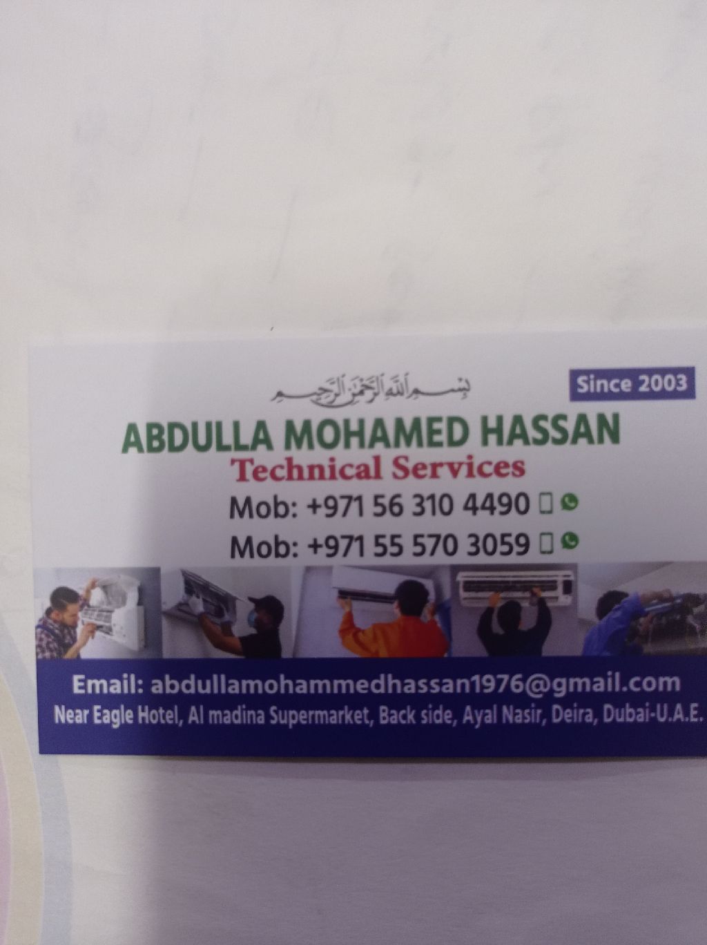 Abdullah Mohammed Hassan technical service, our team is a experience AC refrigerator technical working for good job our location Dubai, ayel nasser shop number 9, experience people is a good job Bangladeshi and Indian technician very quickly good service after 2 hour AC refrigerator discount price any parts of people is a better service