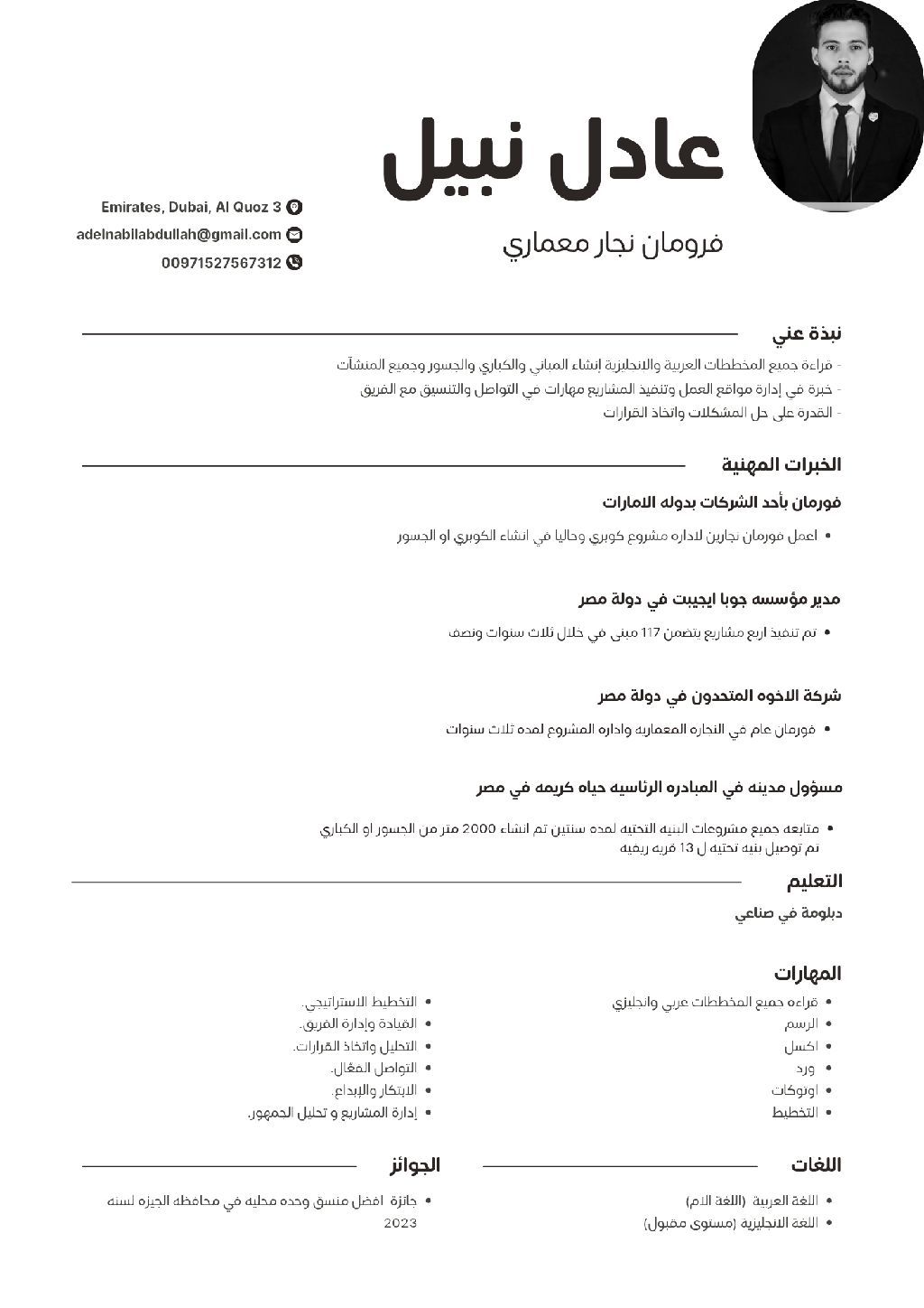 أنا فورمان نجاره معماري خبرة في قراءة المخططات عربي وانجليزي وخبرة في انشاء الكباري في دبي ابحث عن عمل في شركة وليس مقاول