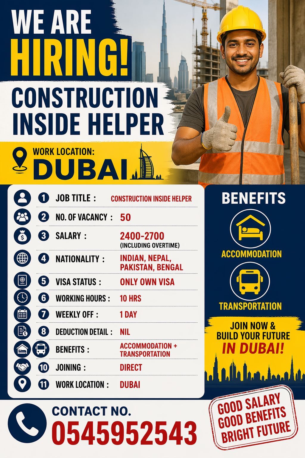 We need male for construction worker helper job urgent hiring direct joining job located in Dubai vacancy located in International City Dubai