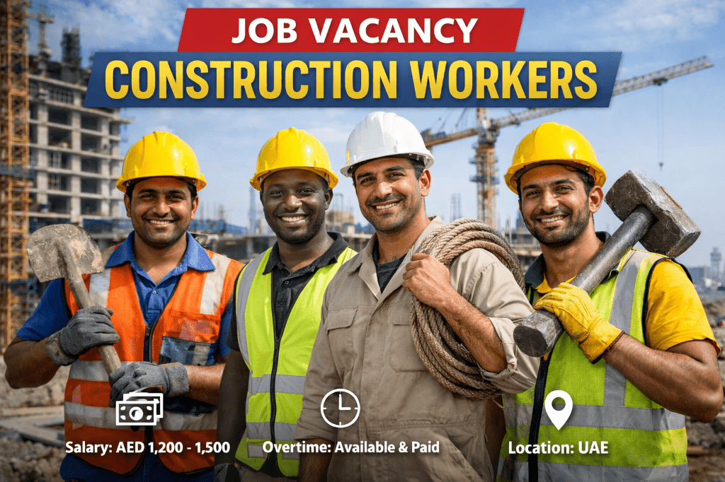Job Opportunity - Construction Workers A reputable contracting company in Dubai South - UAE is hiring construction workers. We offer a salary ranging from AED1200 to AED1500, with paid overtime available. Please contact us for further information. Located Dubai South (near al maktoum international airport)