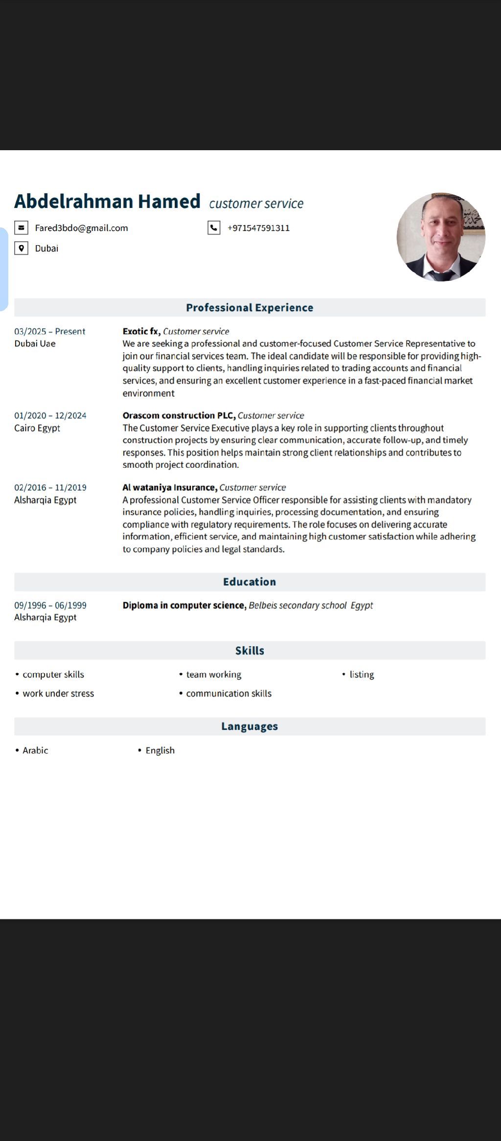 موظف كول سنتر عربي بخبرة داخل الامارات عملت في شركتي Exotic FX وSeven Capital. خبرة في الرد على المكالمات، متابعة العملاء (صادر ووارد) حل الشكاوى، واستخدام أنظمة CRM. أتميز بمهارات تواصل قوية والالتزام بالعمل. بناء علقات طويلة الامد. مهارة تواصل واقناع العملا. متاح للعمل فورا