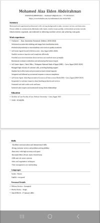 Call Center and Banking Professional with over 4 years of experience in customer service, sales, and back - office operations. Skilled in handling high - volume calls, resolving customer complaints, and promoting banking products such as credit cards and loans. Experienced in working with major financial institutions including National Bank of Egypt and Commercial International Bank. Strong communicat