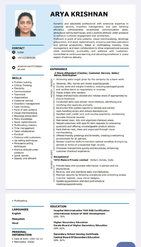 I am Arya Krishnan. Looking for new opportunities in Reception, Customer Service and Cashier. I was working in ADNOC Distribution Retail Dept and I have 2 year experience. I am currently in Dubai. I am very passionate in working the above mentioned roles and for my better career growth I am seeking for new opportunities. I have 2 year experience in handling Cash, Card payments, Handling Customers