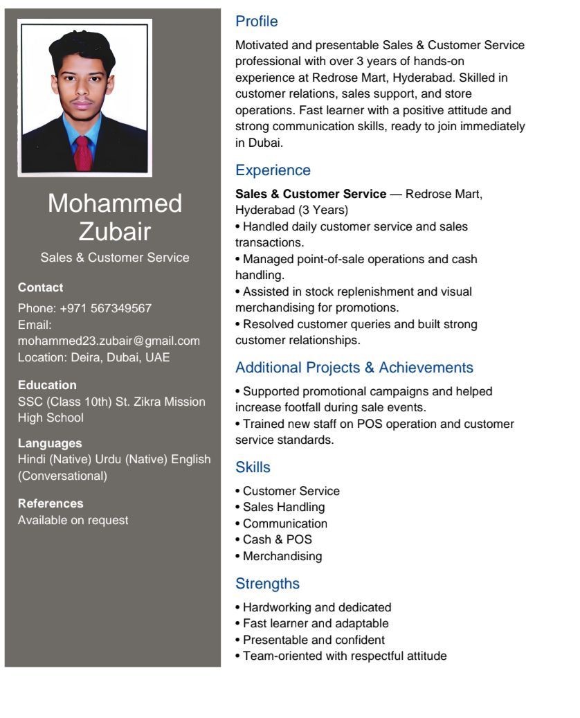 Hello, My name is Mohammed Zubair. I am actively looking for a Sales position in UAE. I have good communication skills, customer handling experience, and I am quick to learn. I can join immediately