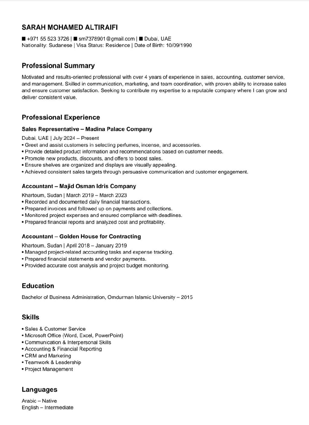 يوجد لدى خبرة داخل إمارة دبي في قسم المبيعات لمدة سنة ونصف
