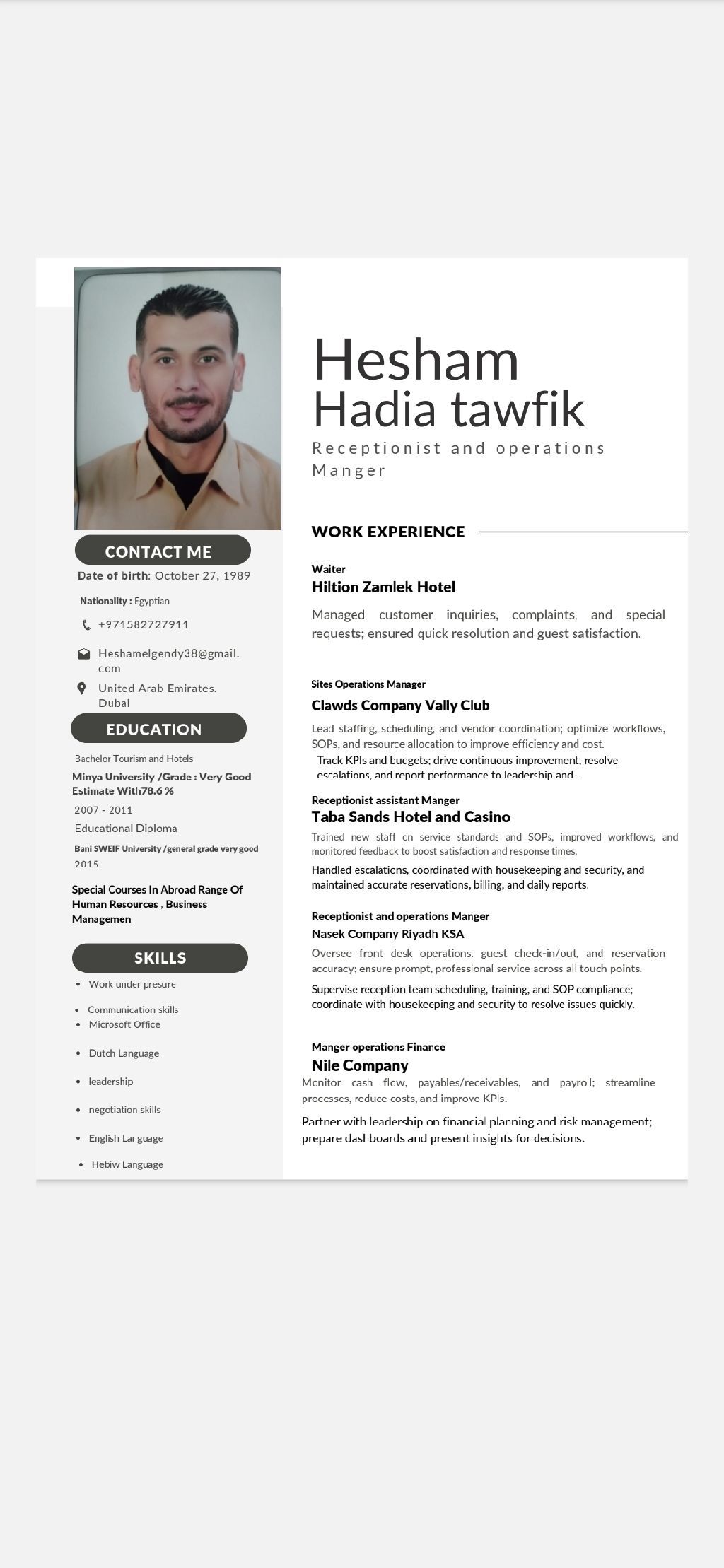 I have OVER 5 Years OF Experience IN Management Office Reception, AND I am SKILLED IN Communication SKILLS, PROBLEM SOLVING, TEAM Work, Customer Service, AND I am PASSIONATE About CONTRIBUTING TO YOUR Company Success I HOPE Contact Thanks