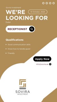 تعلن شركة رائدة في مجال الاستثمار عن حاجتها الى موظفة استقبال بدوام 5 أيام بالأسبوع، تتمتع باللباقة والقدرة على تنظيم المهام والتعامل الممتاز مع العملاء براتب 3500 - 4500 الموقع شارع المطار بالقرب من مترو ggico الرجاء ارسال أل CV على واتساب أو الايميل