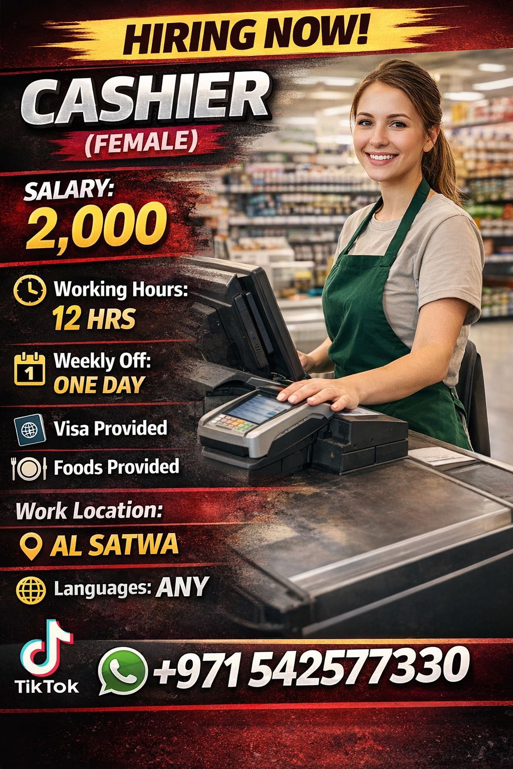 Cashier Salary - Working hours - 12 hrs Weekly off - One day Nationality - Any Benefits - Visa/ Foods Work Location - Al Satwa, Dubai Job role and duty main Responsibilities Handle cash, card, and digital payments accurately Issue receipts, refunds, or change to customers Maintain daily cash balance and report any differences
