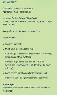 Female receptionist needed for real estate office. Salary plus commission. Own visa and computer knowledge required. Experienced candidates preferred. Location Trade Center 1 SZR, Dubai. Contact via