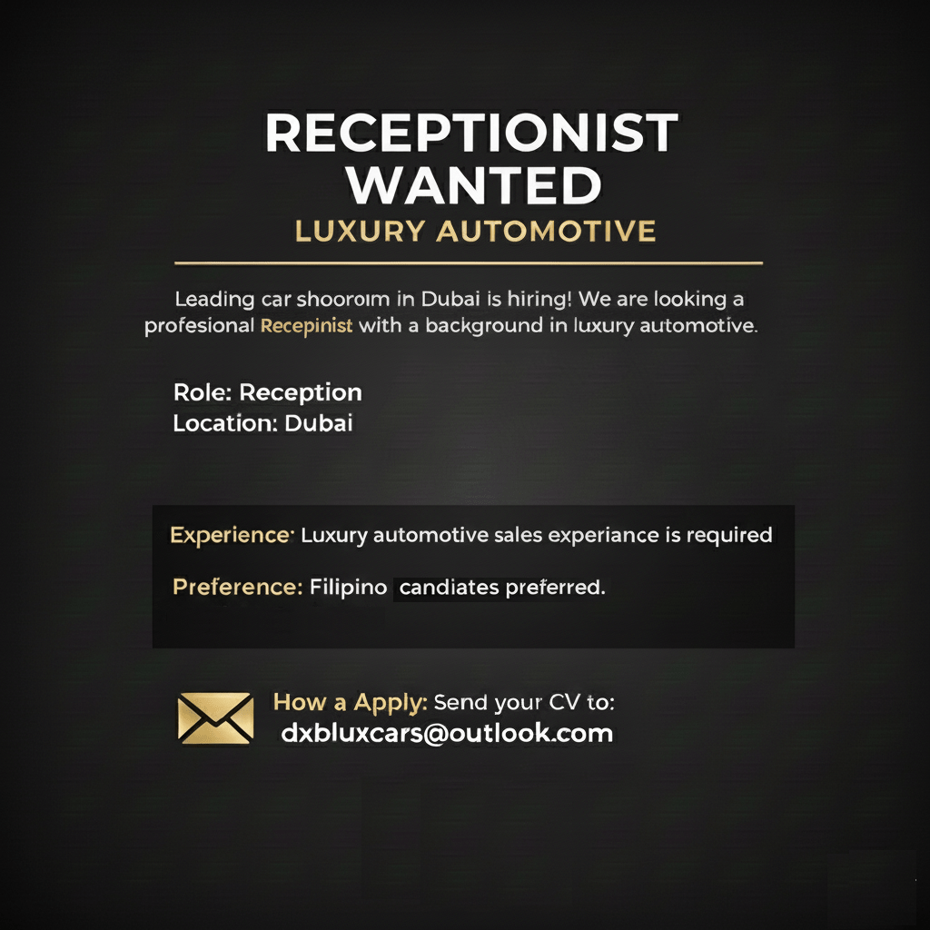 Receptionist Wanted Luxury Automotive Hiring a professional Receptionist for our luxury car showroom in Al Quoz, Dubai. Requirements Must have experience in the luxury automotive industry. Professional appearance and excellent communication skills. Preference Filipino and Syrian male candidates. Role Details Position Showroom Receptionist Location Al Quoz, Dubai How to Apply Please send your