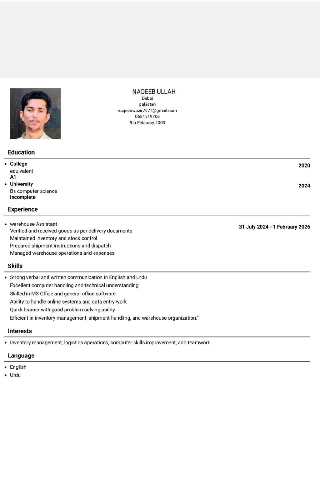 Hardworking and reliable professional with experience in data entry and inventory management. Skilled in MS Office, record keeping, and office support. Holding own UAE visa and available to join immediately. Can speak English and Urdu. Seeking a job as Data Entry Operator, Storekeeper, Inventory Controller, office work