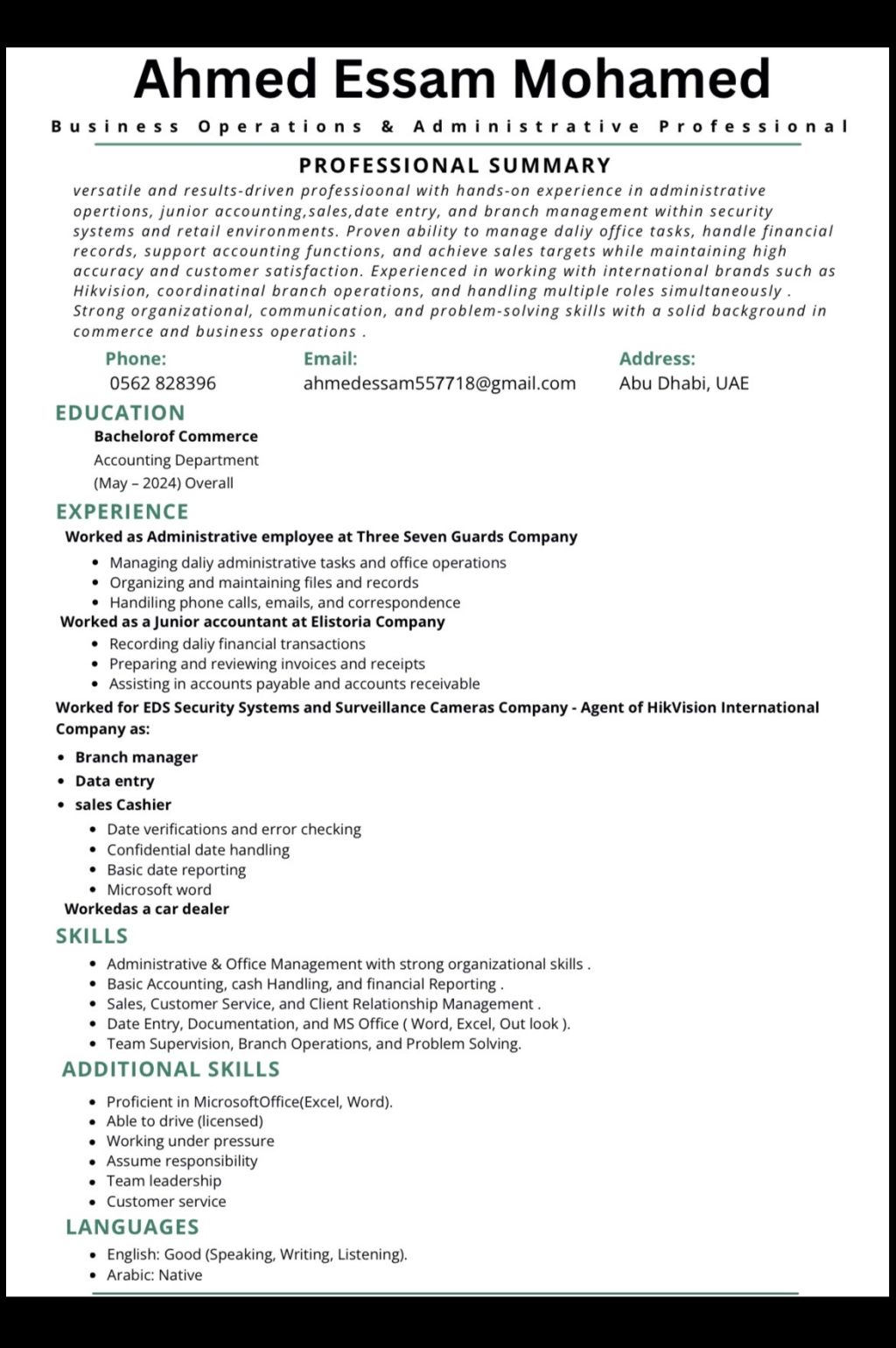 مدخل بيانات ومدير معرض وسيلز لدي شركات خاصه متميز في حل المشاكل لدي العملاء وادارة المخزون وادخال المشتريات وادارة العمال استقبال العملاء بشكل ممتاز ارسال تقارير يوميه وأسبوعيه خبرة 3 سنوات وخبرة 6 أشهر ك موظف اداري لدي شركة خاصه تخليص أوراق الموظفين وعمل انترفيو للموظفين الجدد العمل علي برنامج الأكسيل والأمين وأودو اللغة ألام العربية والانجيليزيه جيده والعمل داخل الامارات 3 أشهر منسق عماليات وHR