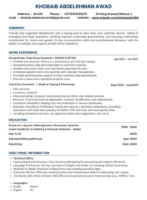 I am a Computer Science graduate with skills in IT support, data entry, and computer networking. I am experienced in Microsoft Office tools including Word, Excel, Access, and Publisher. I also hold both UAE driving and bike licenses allowing me to support both technical and operational roles. I am currently and urgently seeking opportunities in IT support, administrative roles, or data entry